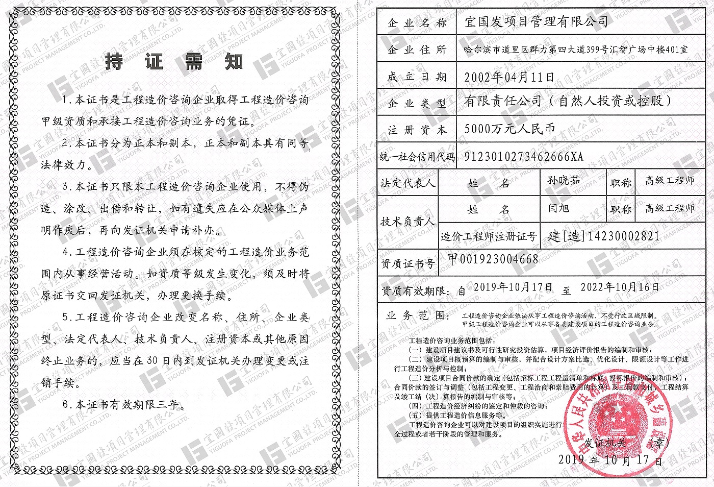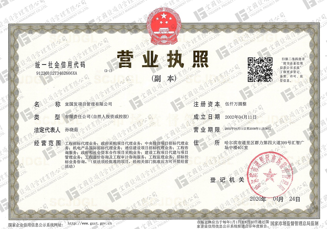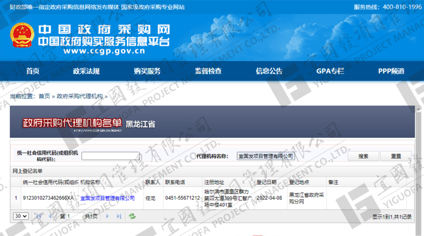 宜國發(fā)項(xiàng)目管理有限公司(原名黑龍江國發(fā)項(xiàng)目管理有限責(zé)任公司)成立于2002年4月,公司注冊資金5000萬元人民幣,具有獨(dú)立法人資格。現(xiàn)具備國家住房和城鄉(xiāng)建設(shè)部頒發(fā)的工程招標(biāo)代理機(jī)構(gòu)甲級資質(zhì),發(fā)展和改革委員會頒發(fā)的中央投資項(xiàng)目招標(biāo)代理機(jī)構(gòu)甲級資質(zhì)、財政部頒發(fā)的政府采購代理機(jī)構(gòu)甲級資質(zhì),黑龍江省住房和城鄉(xiāng)建設(shè)廳頒發(fā)的工程造價咨詢企業(yè)甲級資質(zhì),并已納入全國投資項(xiàng)目在線審批監(jiān)管平臺工程咨詢單位備案名單、“中國政府采購網(wǎng)”政府采購代理機(jī)構(gòu)名單及“中國國際招標(biāo)網(wǎng)”機(jī)電產(chǎn)品國際招標(biāo)代理機(jī)構(gòu)名單,且通過了質(zhì)量管理體系、環(huán)境管理體系、職業(yè)健康安全管理體系認(rèn)證。